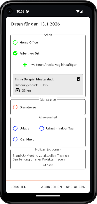 Erfasse regelmäßige Arbeitswege sowie einzelne beruflich bedingte Fahrten.