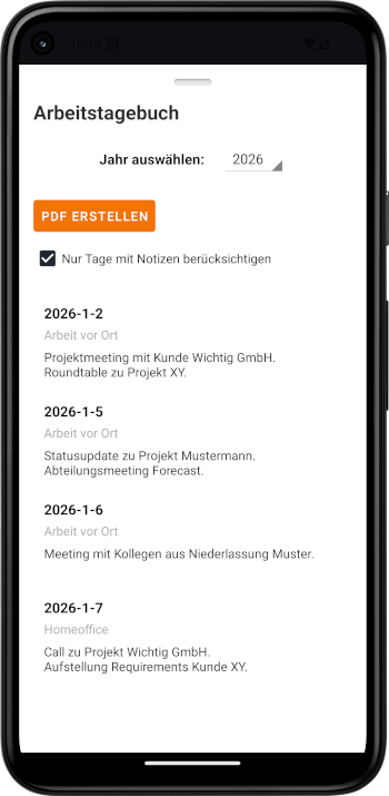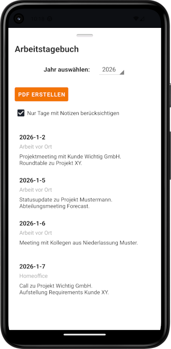 Mache dir Notizen zu jedem Arbeitstag und lasse dir bei Bedarf ein Journal als PDF erzeugen.