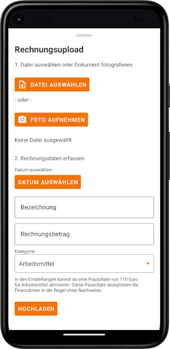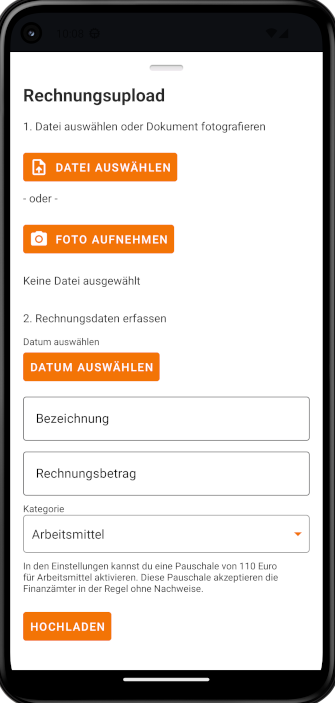 Lade Rechnungen hoch oder fotografiere deine Belege einfach.