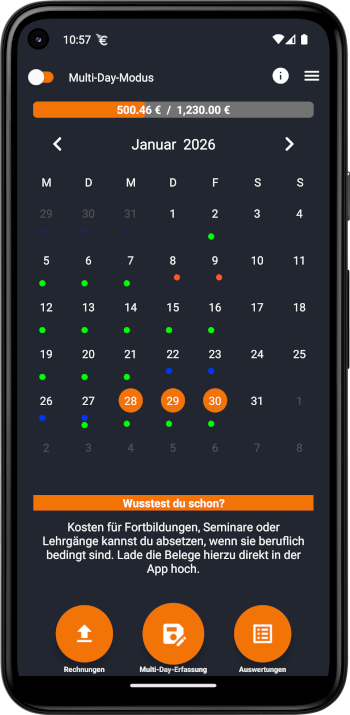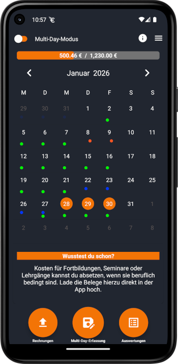 Ein Statusbalken zeigt dir jederzeit an, wie hoch deine aktuellen Werbungskosten bereits sind und ob du die aktuell gültige Werbungskostenpauschale bereits überschritten hast.