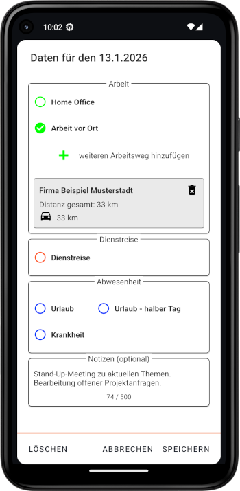 Erfasse regelmäßige Arbeitswege sowie einzelne beruflich bedingte Fahrten.
